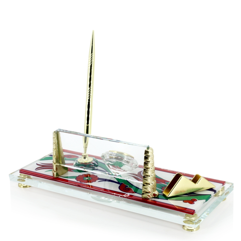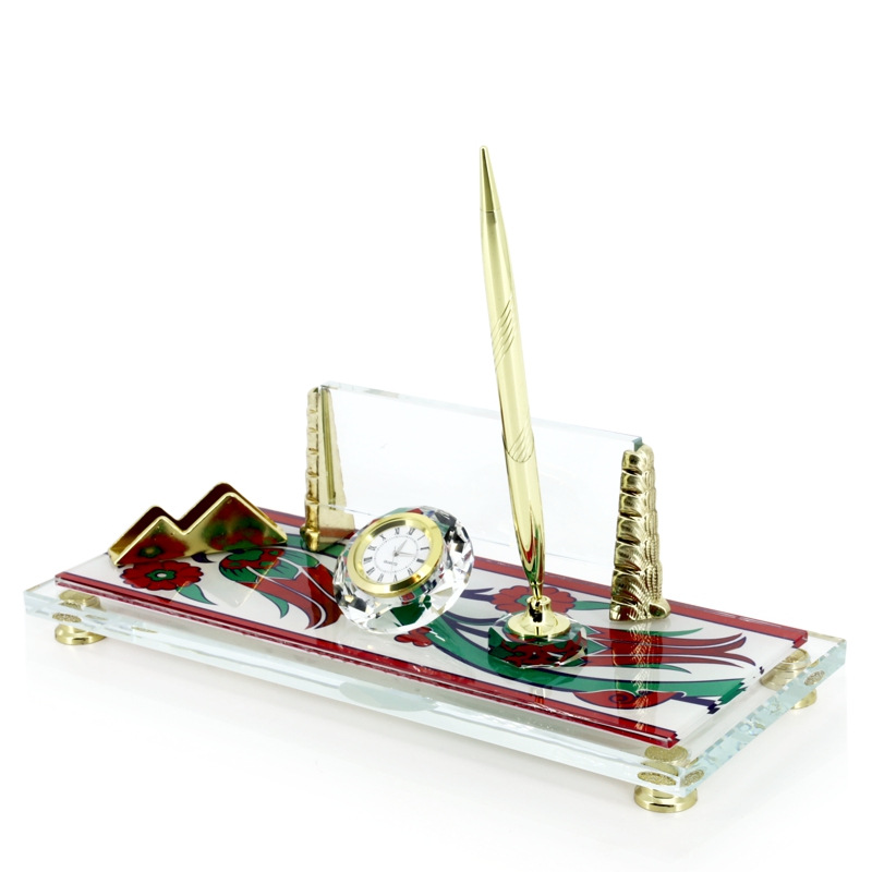 Çini Desenli Masa İsimliği Örnekleri 12cmx29cm boyutunda metal ve saat aksesuarlı