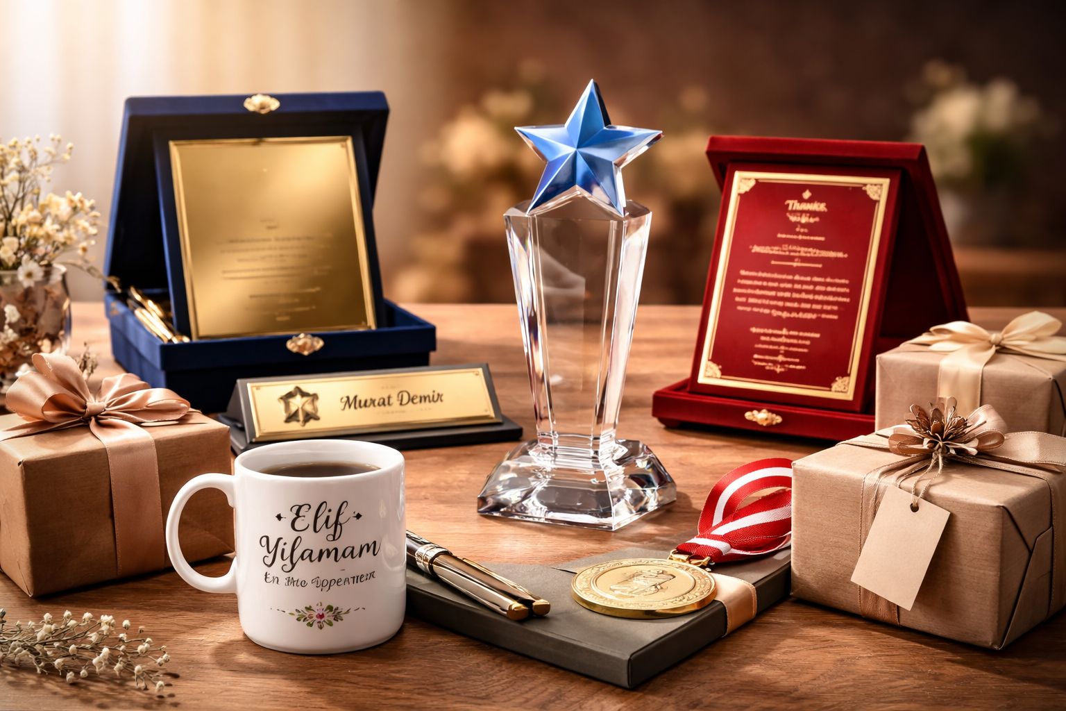 Plaketler, kristal hediyeler, kupa bardaklar, madalyalar ve masa isimlikleri gibi ürünler bu konuda gerçekten iyi alternatifler sunuyor.